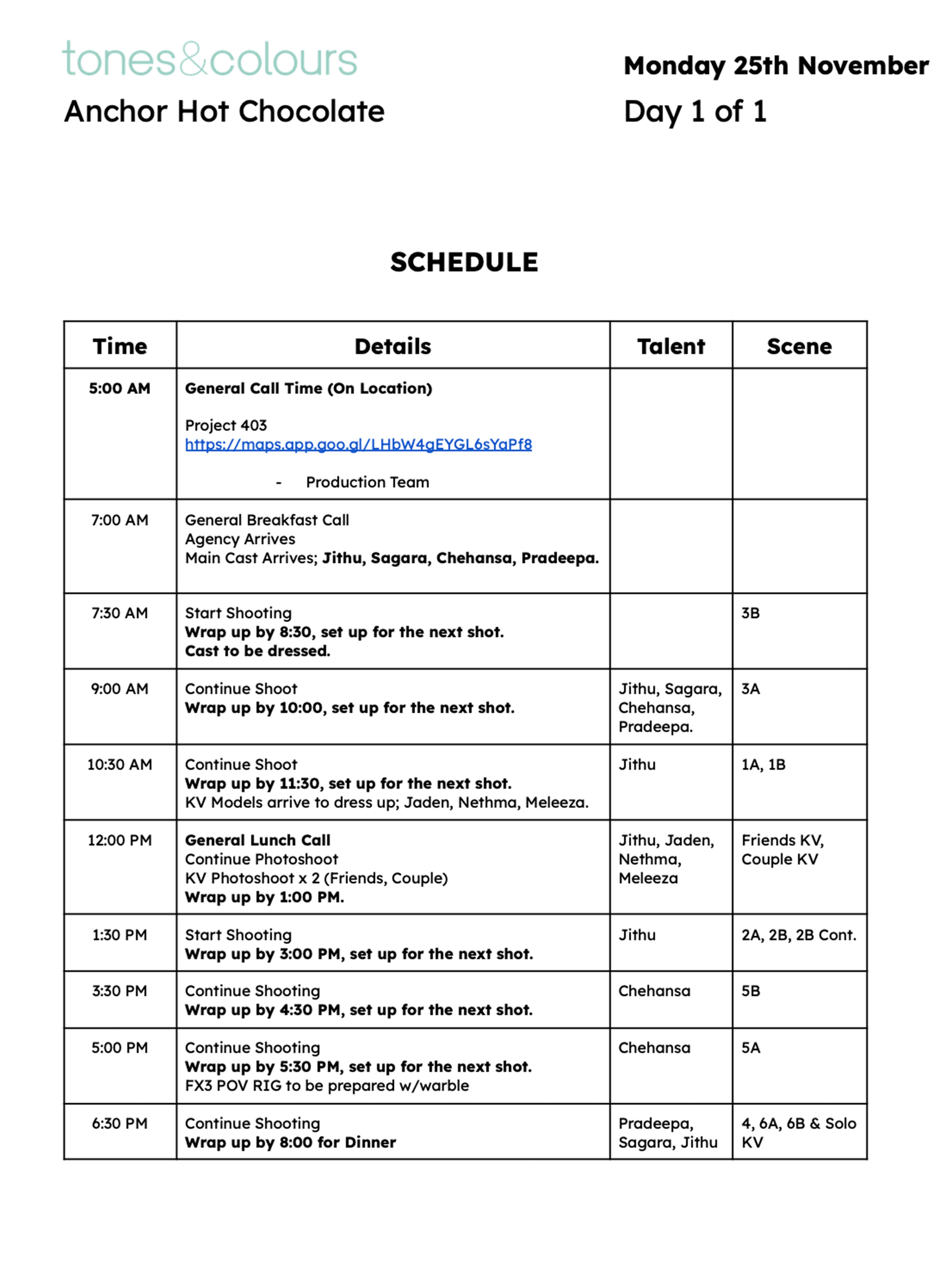A detailed call sheet outlining the day’s schedule, location, and contact information is made and shared with every single person involved in the shoot. This ensures everyone knows where they need to be and when they need to be there.